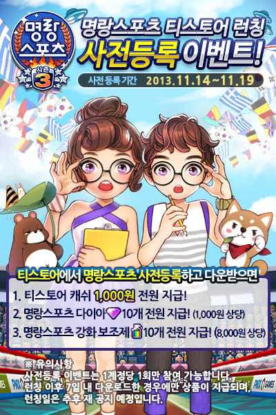 ...명랑스포츠 티스토어 사전등록 이벤트는 1계정 당 1회에 한해 진행되며 핸드폰 번호와 카카오게임 회원번호를 입력하는 것만으로 간단하게 이벤트 참여가 가능하다. 기존 ‘명랑스포츠’ 이용자들과 신규 등록자 모두 사전등록 참여하고 티스토어를 통해 런칭일 7일 내에 ‘명랑스포츠’ 게임을