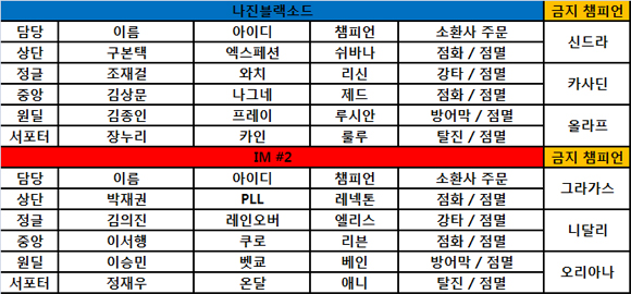... 소드는 상대적으로 라인전에서 리븐에게 약한 모습을 보이는 제드를 상단으로 돌리며 리신과 함께 안정적인 성장을 도모했다. 또한 김종인(루시안)-장누리(룰루) 듀오를 중단으로 보내 '쿠로' 이서행(리븐)의 성장을 막았다. IM은 '레인오버' 김의진(엘리스)의 날카로운 중단
