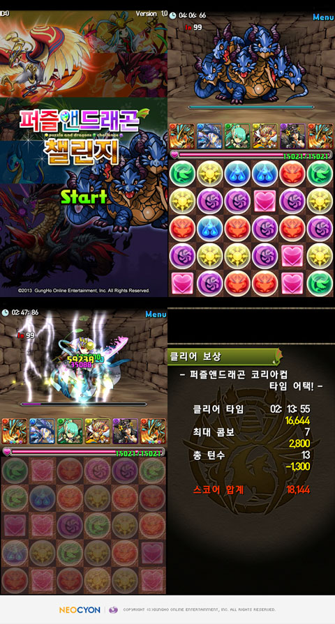 ... 제한 시간보다 더 빨리 던전을 완료한 경우 남은 시간은 포인트로 변환되며, 최대 콤보 수나 총 턴 수에 따라 포인트의 득실이 있어 최고점에 도달하기 위해서는 전략이 필요하다. 네오싸이언은 챌린지 앱으로 지스타2013 기간 동안 ‘퍼즐앤드래곤’의 한국 챔피언을 가리는 현장 이
