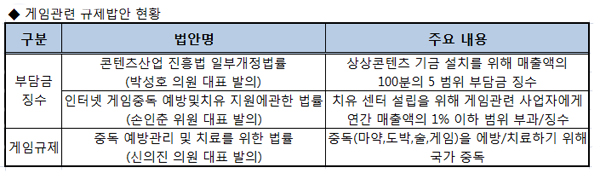 ... 신 의원은 규제가 아니라고 주장하고 있는 반면 뒤에 언급한 두 가지 법안의 경우 직접적으로 게임 기업에 부담금을 징수하겠다는 안을 골자로 하고 있다. 박성호 의원 법안은상상콘텐츠 기금 설치를 위해 매출액의 100분의 5 범위에서 부담금을 징수하겠다는 내용을 담고 있고, 손인춘
