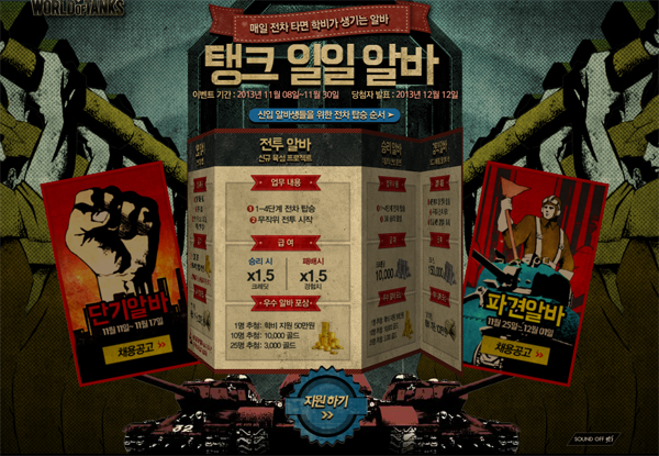 ... 먼저 오는 30일까지 진행되는 ‘일일알바’의 경우 11월달에 가입한 신규유저를 대상으로, ‘월드오브탱크’ 전차 5단계 달성 시 1,000골드와 프리미엄 계정 7일권을 전원에게 증정하며 추첨을 통해 1명에게는 학비 지원금 200만원을 지급한다. 이와 함께 승리횟수, 경험치