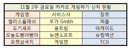 ... 이어 뉴엔소프트는간단한 터치로 즐기는 슈팅 액션 '오늘도빵야빵야'를 들고 나왔으며 게임젠은삼국지를 배경으로한 TCG '포켓삼국지'를 선보였다. 카카오 게임하기는 매 주 화요일과 금요일 두 차례 신작을 선보이고 있다. 이번 주에는 화요일 5종, 금요일 4종으로 총 9종의 신