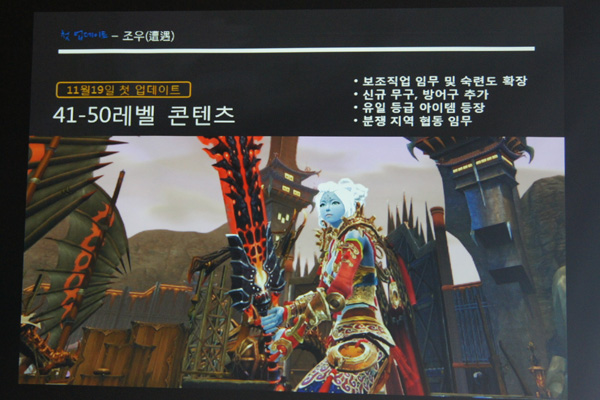 ... 한편 오는 19일 진행되는 조우 업데이트에서는 ▲최고 레벨이 50으로 상향, ▲사천과 무경 등 RvR 지역 공개, ▲ '분쟁지역 협동 임무' 추가 ▲신규 던전 '광기의 투기장'. '건욱건왕의제단' 등 다양한 콘텐츠가 추가될 예정이다. 또한 향후 한 달에 한 번 대규모