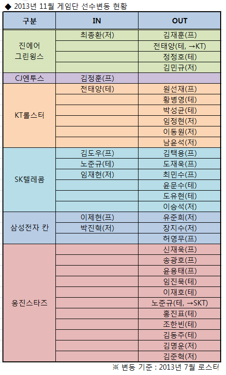 ... e스포츠 시장에서 FA 제도가 시행된 뒤 최초로 이적이 성사된 케이스로 화제가 되기도 했다. KT로서는 박지수 이탈 후 이영호의 백업 요원을 얻어 팀 전력에 큰 보탬이 될 것으로 전망하고 있다. 하지만 빛이 있으면 어둠이 있듯 팀을 떠난 선수들이 무려 6명이나 됐다