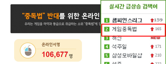... 협회는 이 법안에 반대해 최근 회의를 열고 '게임중동법'에 공동 대응하는 성명서를 발표하고 온라인에서 반대 서명운동을 진행하고 있다. 지난 10월 28일부터 시작된 '게임중독법' 반대 서명운동에는 이미 10만여 명이 넘는 네티즌들이 참여했으며 참가자는 계속 증가 중이다.