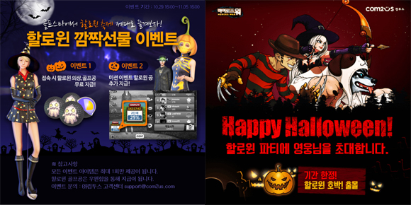 ... '히어로즈워'는 '할로윈 이벤트'와 '마법의 솥단지' 등 2가지 이벤트를 각각 11월 3일과 11월 11일까지 동시 진행한다. '할로윈 이벤트'는 할로윈 의상 스킨 3종을 추가하고, 기간 한정으로 출몰하는 할로윈 호박을 찾는 할로윈 던전을 오픈한다. 또 이벤트 기간 동안