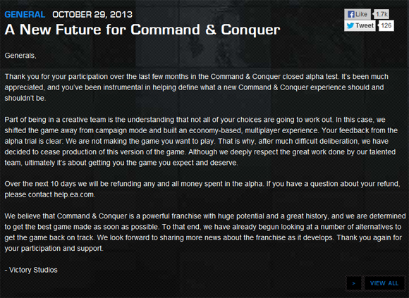 ... 2003년 개발사 웨스트우드스튜디오가 EA에 인수합병되면서 빅토리스튜디오에서 후속작 개발을 추진해왔다. EA는 지난 8월 C&C의 클로즈 베타테스트 참가자를 모집하며 시리즈 부활을 알렸다. 하지만 게임의 완성도가 기대에 미치지 못해 개발을 취소했다고 회사 측은 설명