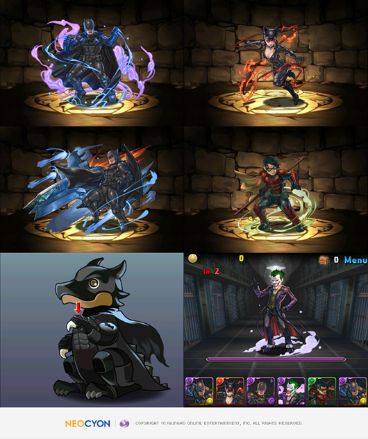 ... 콜라보 전용 '배트맨 아캄 에그'에서는 로빈이나 캣우먼 등 배트맨에 등장하는 5종류의 캐릭터를 획득할 수 있다. 기타무라 요시노리 네오싸이언 대표는 "퍼즐앤드래곤이 세계적으로 사랑 받아온 배트맨과 콜라보레이션을 진행하게 돼 기쁘다"며 "배트맨이 던전에 등장하는 색다른 재
