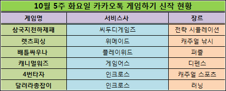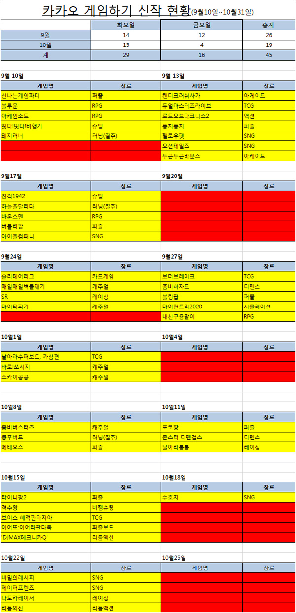 ... 금요일판은 첫 회 각기 다른 장르의총 7개 게임이소개되며쾌조의 출발을 보였다. 주 2회 정책이카톡 입점 기회가 확대될 것이라는 기대감이 팽배하면서중소모바일게임사로 부터 환영받았다. 긍정적 평가는 여기까지였다