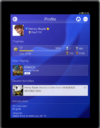 ... 해당 앱을 통해 친구 목록, 트로피 리스트, PS 블로그 등 다양한 PS4 정보를 확인할 수 있다. 요시다 슈헤이 사장은 "앱을 통해 PS 프로필 접속은 물론 PS4 및 PS 앱 친구들에게 메세지를 보낼 수도 있다"며 "심지어 음성메시지까지 지원한다"고 말했다. 이어 "친
