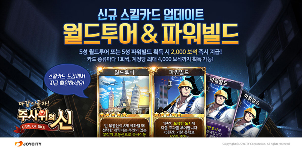 ... 조이시티는 이를 기념해 오는 19일까지 신규 스킬 카드를 획득한 모든 유저를 대상으로 ‘2천 보석(게임캐쉬)’을 지급하는 이벤트와 함께 보석 소진에 따라 신규 스킬 카드를 획득할 수 있는 ‘슈퍼레어카드팩 시즌4’ 이벤트를 진행한다. 주사위의신은 남녀노소 누구나 쉽게 즐길