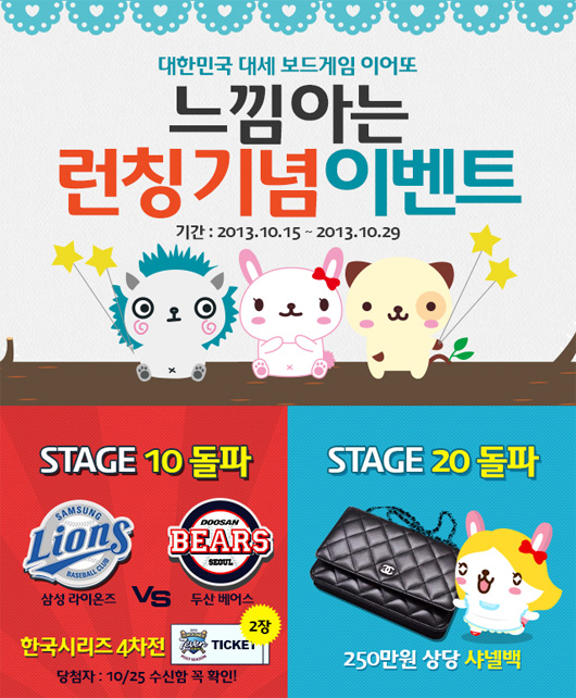 ... 또 8시 50분에 개최되는 대회에서 7등을 기록한 유저에게 2장의 티켓이 제공된다. 회사 측은 "프로야구 한국 시리즈 티켓을 예매하지 못한 야구팬들에게 좋은 기회를 제공할 것"이라며 "1분이라는 짧은 시간 동안 손에 땀을 쥐게 하는 '이어또' 한 판 승부를 기대한다"고 전했