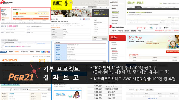 ... 이번 기부에 PGR21은 국경없는의사회, 국제앰네스티 한국지부, 굿네이버스, 기아대책, 나눔의 집, 세이브 더 칠드런, 월드비전, 유니세프한국위원회, 코피온, 한국컴패션, 홀트아동복지회의 11개 NGO에 각 100만 원씩 총 1100만 원을 기부했다. 또한, e스포츠 관련