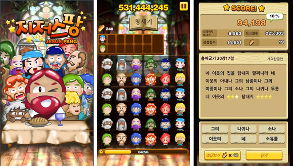 ... 1분 내 일정 점수에 도달하면 다음 스테이지로 넘어갈 수 있으며 성경 구절도 함께 획득한다. 점수가 미달되면 성경 퀴즈로 다음 스테이지로 이동할 수 있다. '지저스팡'은 총 66개의 스테이지, 2500개 이상의 성경 구절을 제공한다