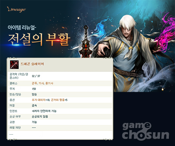 ... 그 첫 번째로 16일 업데이트에서 생명의 검, 포르세의 검 등 10종의 아이템을 빈티지 아이템으로 선정해 리뉴얼했다. 그중 주목할 것은 '드래곤 슬레이어'인데, 리니지 전설 무기로 유명한 '진명황의 집행검' 보다 뛰어난 성능으로 재탄생되었다. 새로운 지존 무기가 등장한 셈이