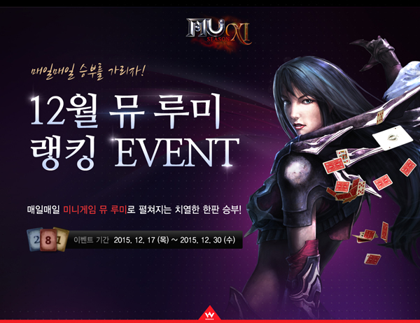 ... 웹젠은 루미 점수를 기준으로 각 서버의 1위부터 100위까지 상위 회원들에게 ‘2랭크 7레벨 광휘의 에르텔’과 ‘1,000루드’, ‘신비의돌’ 등 게임 내 최고급 아이템들을 지급한다. 해당 이벤트는 뮤 온라인 테스트 서버/뮤 블루 아이스 서버를 제외한 모든 서버의 회원들이 참