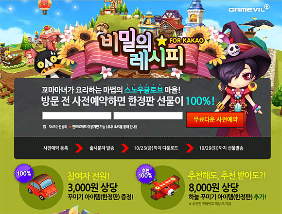 ...비밀의레시피 사전 예약 이벤트는 게임빌 홈페이지를 통해 누구나 참여할 수 있으며 참가자 전원에게는 한정판 아이템인 빨간자동차를 증정하고 친구에게 게임을 추천하거나 받으면 하늘 꾸미기 아이템인 빨간비행기를 추가로 얻을 수 있다. ※ 비밀의레시피 사전등록 페이지 :http://cros