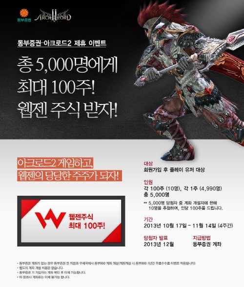 ... 단, 동부증권 거래계좌가 없는 당첨자의 경우에는 주식 수령을 위해 계좌(동부990)를 신설해야 한다. 17일 정식서비스를 시작하는 '아크로드2'는 두 개의 진영(에임하이, 데몰리션)이 절대군주 '아크로드'가 되기 위해 '도시침공전', '암살전' 등 약 40여개의 전장에서