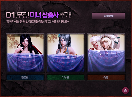 ... 일정 관문을 통과할 때마다 면사포로 가린 미녀의 얼굴이 단계별로 공개되며 모든 조건을 만족시키면 삼국지에 등장하는 여성 무장을 획득할 수 있다. 새로운 플레이 환경을 원하는 기존 유저들을 위해 전투 시스템도 다양하게 준비됐다. 우선 개인 위주의 전투가 아닌 3명이 팀