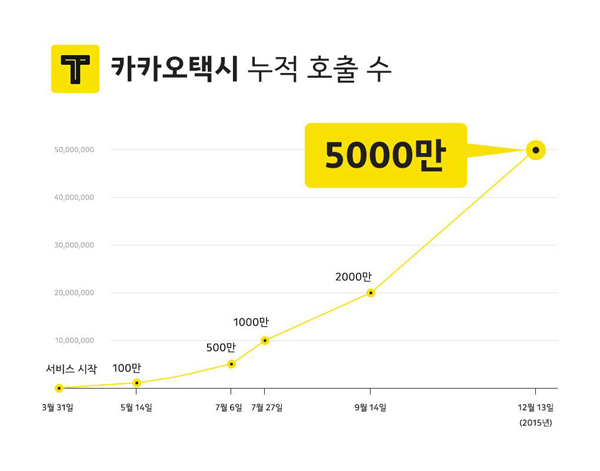 ...카카오는 모바일 플랫폼을 통해 많은 불편을 해소하고, 편의를 제공하고자 노력해왔다. 카카오택시 출시 후 접수된 의견과 현장의 이야기를 듣고 이를 반영해 수시로 서비스 업데이트를 진행했다. 회사 측은 이용자의 목소리에 항상 귀를 기울이며 발전을 거듭한 것이 5천만 번 이상의 호출로