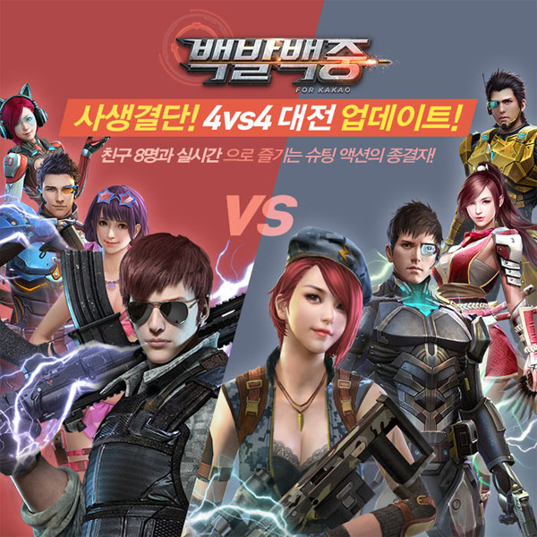 ... 4vs4 대전은 신규 기능 ‘대기방’을 통해 다른 방에 입장하거나, 직접 방을 만들어 친구들과 팀을 이뤄 전투를 할 수 있다. 승리하기 위해선 먼저 25킬을 달성하거나, 15분 내 상대팀보다 많은 킬 수를 획득하면 된다. 이와 함께 ‘백발백중’은 친구와 함께 더욱 끈끈
