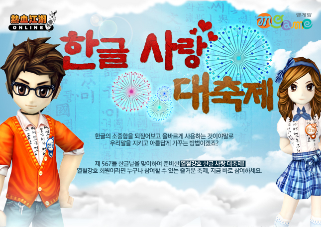 ... 엠게임은 23일까지 3시간 간격으로 채팅창에 출력되는 퀴즈의 정답을 맞힌 유저에게 버프를 제공하고 현발파에 세워진 세종대왕 동상, 훈민정음 언해본 깃발과 함께 스크린샷을 찍어 홈페이지에 등록한 게이머에게 추첨을 통해 아이템과 함께 캐릭터 상품도 지급한다. 조중철 서비스사업