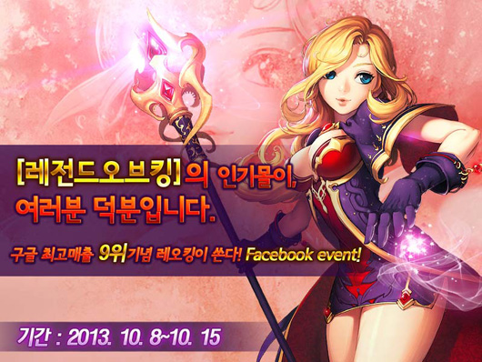 ... 참여 방법은 ‘레전드오브킹’ 페이스북에 축하의 메시지를 남기고 ‘좋아요!’를 누르거나 페이스북 담벼락에 공유하면 된다. 이벤트 참가자에게는 추첨을 통해 문화상품권과 게임 머니 100 다이아를 제공한다 또 레오킹 페이스북 이벤트를 블로그, 카카오스토리 등 다양한 SNS에 홍
