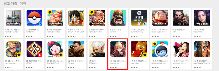 ... △ 2017년 2월 17일 오전 구글플레이 게임 부문 최고 매출 순위 갈무리 2월 신작 '섀도우버스'가 출시 후 꾸준한 상승세를 보이고 있다. 지난 7일 국내 서비스를 시작한 일본 개발사 사이게임즈의 모바일 카드게임 '섀도우버스'는 구글플레이 게임 부문 최고 매출