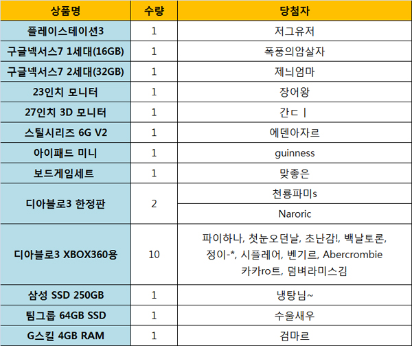... 지난 9월 10일(화)부터 30일(월)까지 진행됐던 창간 14주년 이벤트의 당첨자는 아래와 같습니다. 당첨되신 모든 분께 축하의 말을 전합니다. 다음 이벤트에도 많은 관심과 협조 부탁드립니다