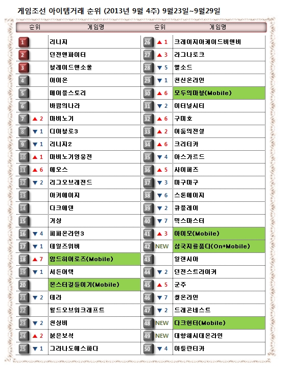 ... 국내 게임 시장에서 어떤 게임의 아이템이 각광을 받고 있는지 게임조선에서는 매주 아이템 거래 순위를 산정, 아이템변화에 따른 시장의 변화를 짚어보았다. 순위차트는 아이템거래 사이트인 아이엠아이(IMI)의 자료에 기반하고 있다. <편집자주> 신작 PC