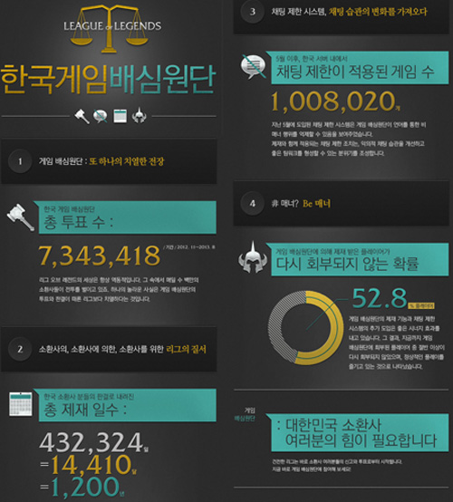 ... 이번에 공개된 성과 자료는 시스템이 도입된 지난 해 11월 말부터 올해 8월 말까지 집게된 것이다. 먼저 시스템에 대한 유저들의 총 참가 건수가 734만을 넘었다. 또한 직접 내린 판결을 통해 실제 해당 게이머에게 제재가 이루어진 기간이 총 43만 일에 달했다