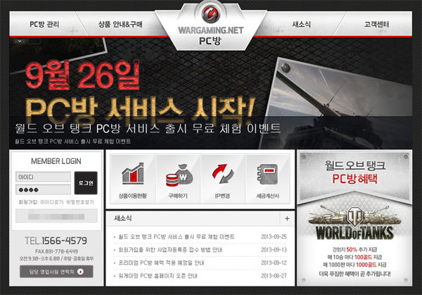 ... 10월 27일 이전에 PC방에서 회원가입을 하면 500골드와 3일 프리미엄 서비스를 제공하며 매주 주말 오후 7시부터 11시까지 PC방에서 플레이 한 유저를 대상으로 'Type59골드 전차'를 비롯한 다양한 선물을 증정할 예정이다. PC방 업주를 위한 프로모션도 함께 진행한다