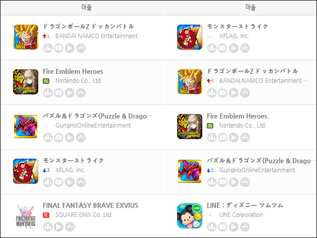 ... △ 일본 애플앱스토어 매출 순위(좌), 구글플레이 매출 순위(우) 지난 3일 북미와 일본, 유럽 등 지역에 출시된 닌텐도의 모바일게임 '파이어엠블램 히어로즈'가 잔잔한 흥행몰이에 나서고 있다. 10일 구글플레이 매출 순위를 기준으로 미국에서 4위, 일본 3위, 영