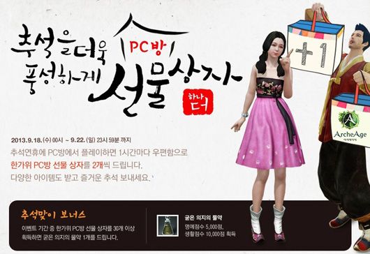 ... 더불어 한가위 PC방 선물 상자를 30개 이상 획득하면 명예점수 5000점과 생활점수 1만점을 획득할 수 있는 ‘굳은 의지의 물약’도 추가로 획득한다. 김재홍 엑스엘게임즈 사업팀장은 “예년보다 긴 추석 연휴 기간을 아키에이지 PC방 이벤트와 함께 보름달처럼 풍성하게 보내