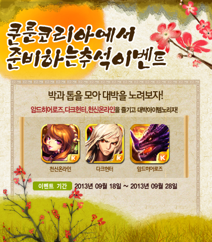 ... 또 신규 유저들에게 게임을 도와주면 혜택을 얻을 수 있는 '동행 시스템'도 추가된다. '천신온라인'에는 18일부터 24일까지 ‘추석 장비 대 방출’ 이벤트를 진행해 게임 내에서 ‘박’ 아이템을 제공, 각종 장비 보물상자 패키지를 제공한다. '다크헌터' 역시 18일부터 2