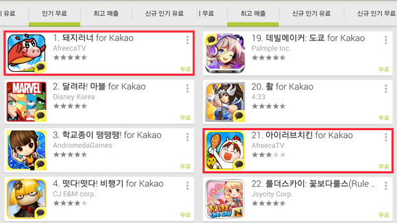 ... 특히 아프리카TV의 모바일게임이 처음으로 구글플레이 순위 1위에 진입했다는 점에서 더욱 고무적이다. 이 게임은 약 100만 종의 돼지 캐릭터를 이용해 점프와 비행을 만끽할 수 있는 점핑런게임으로 사나운 늑대로부터 탈출하는 돼지의 여정을 그리고 있다. '아이러브치킨' 역시