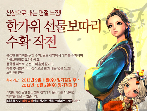 ... 선물보따리에는 게임 내에서 체력회복 등 유용한 기능을 갖고 있는 홍시부터 한가위 머리 장식, 의상, 청심단 등을 획득할 수 있다. 청심단은 이벤트 기간 내에만 사용할 수 있다. 한편 의상은 모두 랜덤하게얻을 수 있으며자신 종족과 맞지 않는 의상은 9월 25일부터 10월