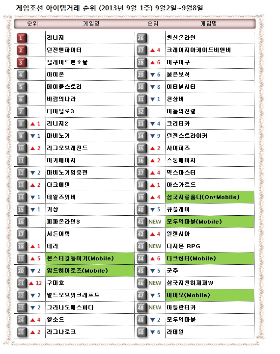 ... 국내 게임 시장에서 어떤 게임의 아이템이 각광을 받고 있는지 게임조선에서는 매주 아이템 거래 순위를 산정, 아이템변화에 따른 시장의 변화를 짚어보았다. 순위차트는 아이템거래 사이트인 아이엠아이(IMI)의 자료에 기반하고 있다. <편집자주> ◆ 몬스터