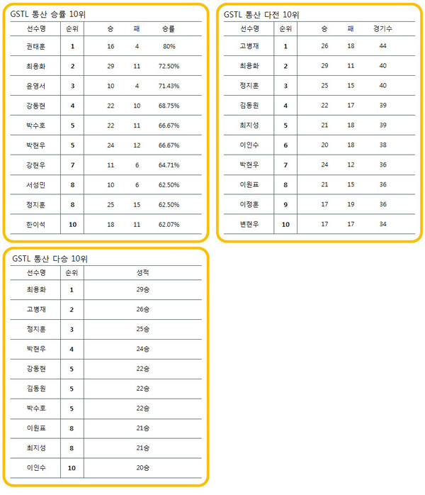... GSTL 통산 승률 1위에 MVP 게임단의 권태훈(Z)이, 다승 1위에는 IM의 최용화(P) 선수가 차지하였으며 가장 많은 경기를 치른 다전 부분에는 FXO의 고병재(T) 선수가 1위를 차지하며 GSTL의 사나이임을 입증하였다. 또한 월 대회가 아닌 정규리그로 시작된 ‘20