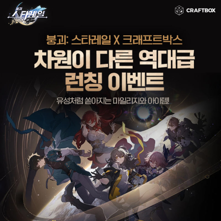 ... 붕괴: 스타레일X크래프트박스 이벤트는 5월 10일부터 4주간 진행되며, 총 14일간 참여할 수 있다. 피카PC방 또는 개인PC 크래프트박스에서 참여 가능하며, 붕괴: 스타레일을 30분 이상 플레이하면 마일리지 또는 아이템 뽑기권을 매일 제공한다. 마일리지와 아이템