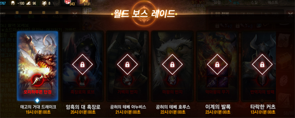 ... ◆ 월드 보스 개편 월드 보스 이벤트가 저녁 시간애 집중되도록 일정을 변경했으며 드롭 아이템에 전설, 영웅 아이템을 추가 했다. ※행운상자 희귀 제작 비법서,힘의 룬(각인),민첩의 룬(각인),지식의 룬(각인), 축복받은 무기 마법 주문서, 축