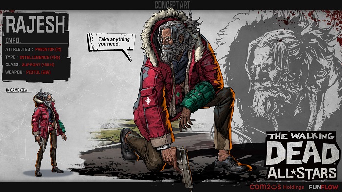 ... 라제쉬는 노인의 모습을 하고 있으나 날렵한 움직임으로 아군의 체력 회복을 돕는 서포터로 활약한다. 의사 출신으로 각종 의료품을 능숙하게 활용하며, 아군의 체력을 회복시키는 필살기와 스킬을 갖췄다. 라제쉬의 스킬은 새롭게 열리는 ‘미지의 생존자’ 던전을 탐