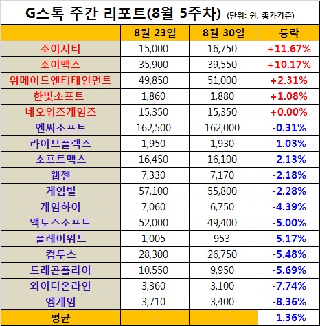 ...36%. 그나마 조이시티와 조이맥스가 10% 이상 상승하며 낙폭을 줄였다. 조이시티는 지난 8월 30일 전주대비 11
