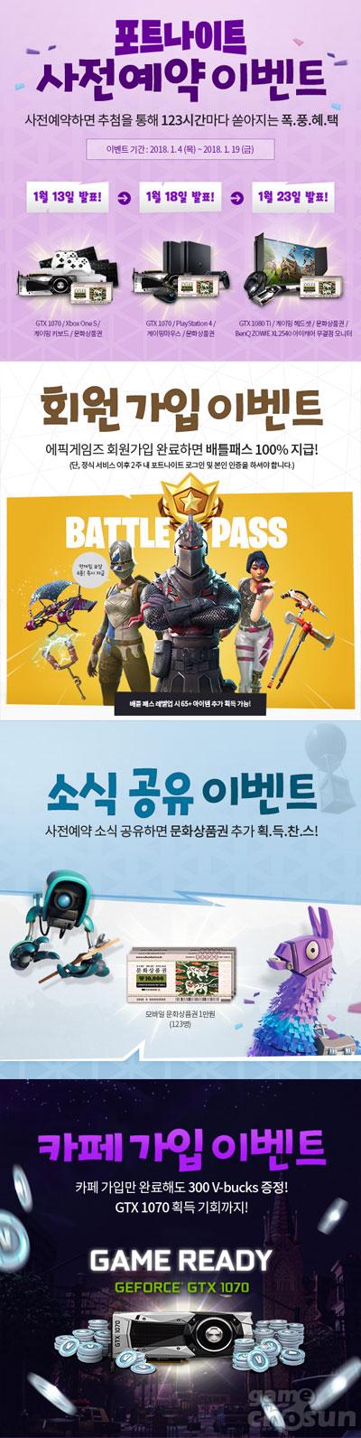 ... 이와 함께 사전예약 기간인 보름 동안 123시간마다 추첨을 통해 플레이스테이션, 엑스박스 원과 GTX 1080 Ti 그래픽카드, BenQ ZOWIE XL2540 아이케어 무결점 모니터, 문화상품권 등 푸짐한 상품을 증정하는 이벤트도 진행한다. <포트나이트>