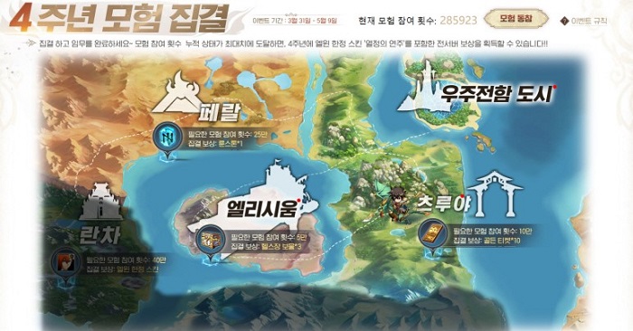 ... 이용자의 모험 참여 횟수 누적으로 완성되는 ‘4주년 모험 집결’이 모험 진행도 25만을 달성에 성공함에 따라 헬스장 보물, 골든 티켓 10장, 룬스톤 1개를 지급했으며, 이후 40만에 도달할 경우 엘윈 한정 스킨 ‘열정의 연주’를 업데이