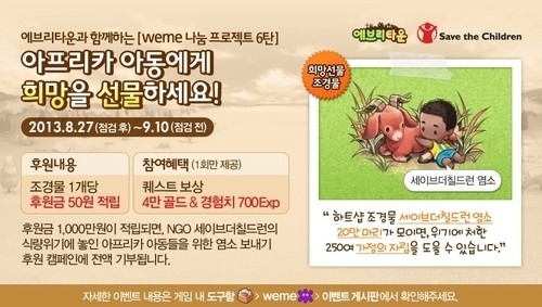 ... 오는 9월 9일까지 한정 퀘스트를 통해 참여 할 수 있는 '빨간염소 보내기'는 하트샵에서 '세이브더칠드런 염소' 조경물을 구매하면 그 금액만큼 식량 위기를 겪고 있는 아프리카 니제르 아동들에게 전액 기부되는 방식으로 진행된다. 위메이드 한 관계자는 "에브리타운 for Ka