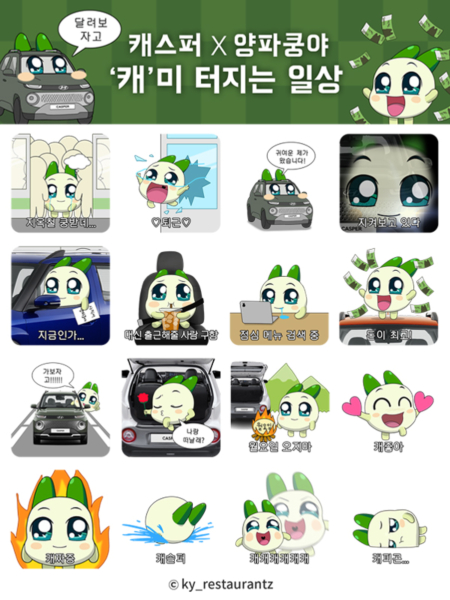 ... 캐스퍼 홈페이지에 로그인해 나만의 캐스퍼 모델을 견적내고, 페이지에 숨은 양파쿵야를 찾은 참여자 대상 선착순으로 이모티콘을 지급한다. 이모티콘은 30일동안 사용 가능하다. 캐스퍼X쿵야 이모티콘 이벤트는 캐스퍼 온라인 페이지에서 참여할 수 있다