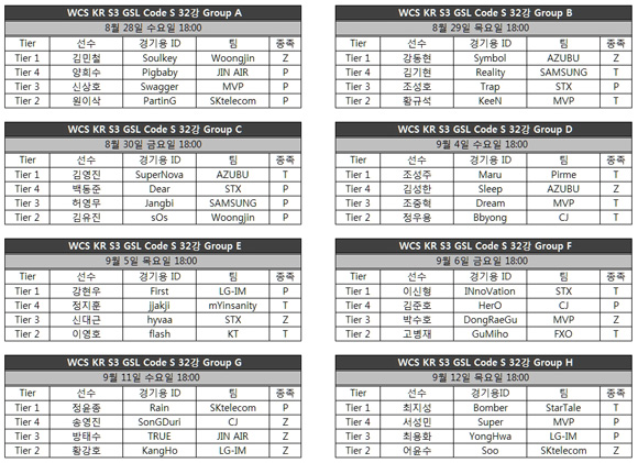 ... 지난 시즌1 GSL 우승자 김민철(웅진스타즈), 양희수(진에어), 신상호(MVP), WCG 국가대표 원이삭(SK텔레콤T1)이 16강 진출을 위해 격돌한다. 곰TV는 개막전 곰TV 강남 스튜디오 현장에서 시즌3 GSL 개막을 맞이해 GSL 출석 체크 카드, 팬미팅 지원프로그램,
