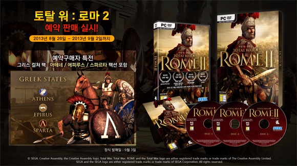 ... 세가피블리싱코리아는 이번 예약판매 기간 동안 게임을 구매한 게이머에게 고대 그리스의 도시 국가 아테네, 에피루스, 스파르타로 플레이할 수 있는 '그리스 컬쳐 팩'을 제공한다. '토탈워:로마2'는 오는 9월 3일 국내 출시되며 가격은 4만5천원이다. [최지웅 기자csage82@