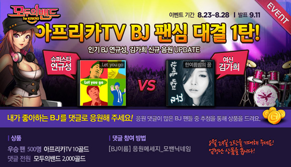 ... 아프리카TV는 연규성과 김가희의 팬들을 위한 '팬심 대결' 이벤트를 진행한다. 이벤트 페이지에 각 뮤지션에 대한 응원 댓글 수와 게임 내 플레이 횟수를 비교해 승부를 가리는 방식이며, 우승한 가수의 팬들에게는 뮤지컬 위대한 슈퍼스타 티켓, 외식 상품권, 아프리카TV 퀵뷰 아